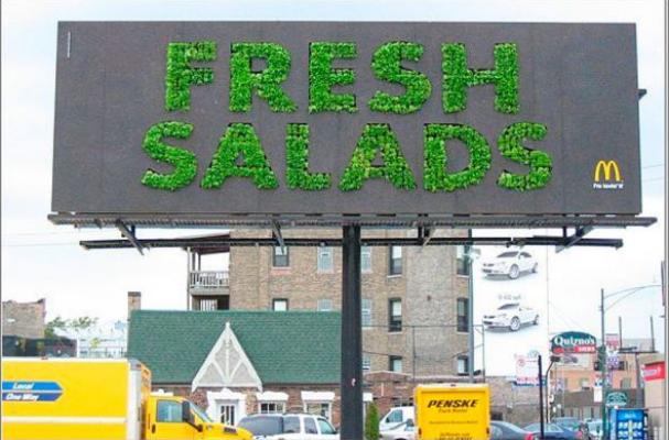 3. McDonald's "Fresh Salads" Billboard: In 2007 and 2009, McDonald's promoted its fresh salads in the Chicago area with a billboard embedded with lettuce leaves. As the edible billboard grew, the lettuce leaves formed the phrase "fresh salads." The ads were created by the Leo Burnett agency in Chicago.