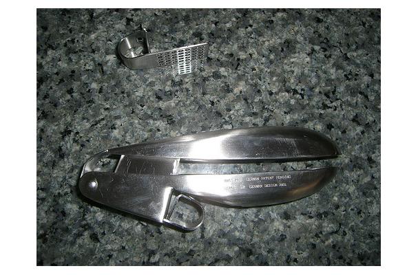A garlic press is a kitchen device that allows one to crush a whole clove of garlic in a single motion. It renders the clove even more finely crushed than if minced with a knife. Cloves can be placed in the press whole with skin on to save even more time, although it may require a bit more pressure. Other uses include crushing ginger, which can be done if the ginger is cut into rounds.