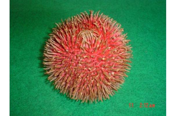 A rare, wild, red skinned durian, 6-10" in diameter. Proabably the sweetest of all the durians. The spines are very prominent in this durian, making the fruit resemble a coiled up sea urchin.