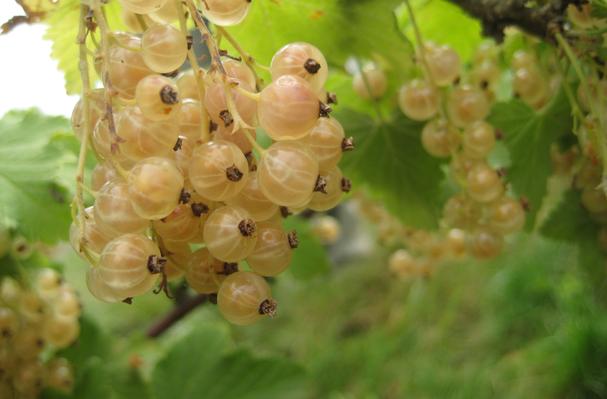 Clusters of translucent white currants with pink blush, richest and sweetest flavor of all currents. Perfect for cooking.