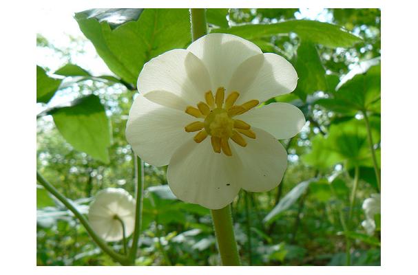 The mayapple that has a single white flower with six petals, produces a yellow-greenish fruit 2-5 cm long.