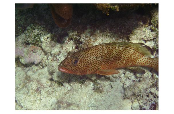 Red Hinds are members of a family of fishes that includes groupers, graysbys, and sea bass. Like many of these fishes, Red Hinds spend much time waiting quietly. These lurking hunters feed by lunging at small fish that come near during their active feeding times. Many fish feed at sunrise and sunset, and spend the rest of the day and night either resting or swimming quietly. The spots all over this fish help it stay hidden.