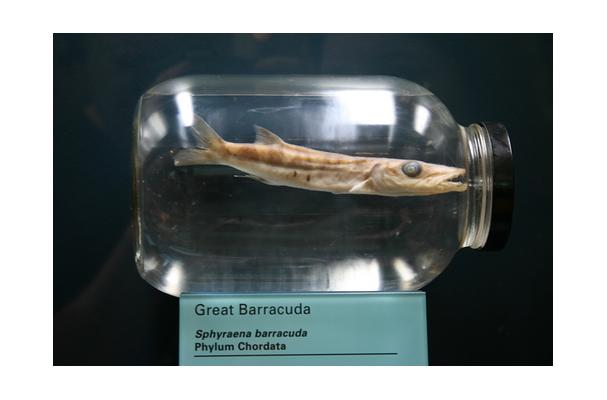 The great barracuda, Sphyraena barracuda (Edwards in Catesby, 1771), is a curious, fearsome-looking, usually solitary predator common to reefs and shallows of Florida and the Caribbean. Distinguished by a torpedo-shaped body, large eyes and mouth, formidable teeth, a double emarginate (notched) tail fin with pale tips on each lobe, and (usually) the presence of a few scattered black blotches on the lower sides. The top of the large head between the eyes is flat or concave. Maximum length 2 m; maximum weight: 50 kg. Environment: pelagic; brackish; marine; depth range 0-100 m. Climate: subtropical; 30°N-30°S.