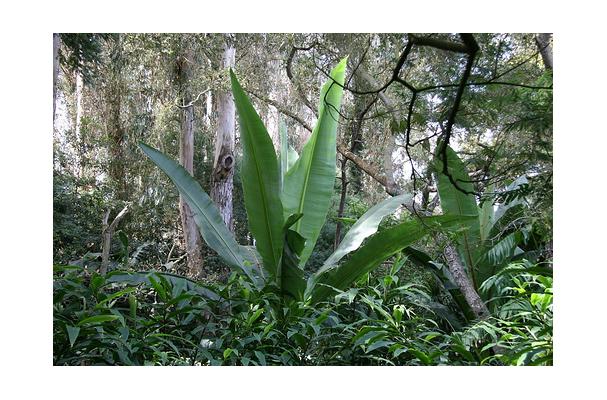 Ensete is a large, fleshy-stemmed plant with a head of banana-like leaves. The plant grows between 6 and 12 m high. It is a monocotyledon and does not have a true, branched trunk, but an unbranched pseudostem formed by the imbricated (overlapping) bases of petioles (leaf stalks), left behind when old leaves die. The pseudostem broadens towards the base and this gives rise to the species name ventricosum, which means 'with a swelling'. The plant seldom forms suckers from the base. The simple, large leaves with a thick, rose-pink midrib and numerous pinnately parallel nerves extending to the margin, are spirally arranged.