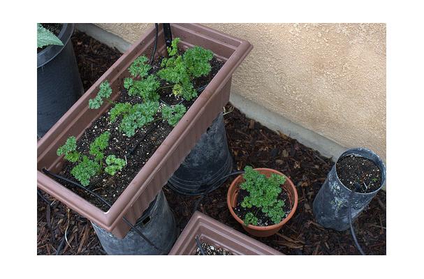 The tightly coiled leaves of Curled Parsley are surrounded here by Italian Flat Leaf Parsley.