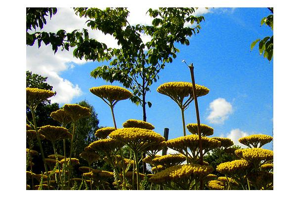 Tansy is a flowering herbaceous plant with finely divided compound leaves and yellow, button-like flowers. It has a stout, somewhat reddish, erect stem, usually smooth, 50—150 cm tall, and branching near the top. The leaves are alternate, 10—-15 cm long and are pinnately lobed, divided almost to the center into about seven pairs of segments, or lobes, which are again divided into smaller lobes having saw-toothed edges, thus giving the leaf a somewhat fernlike appearance. The roundish, flat-topped, button-like, yellow flower heads are produced in terminal clusters from mid to late summer. The scent is similar to that of camphor with hints of rosemary.