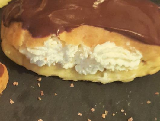 Choux pastry filled with a sweet vanilla cream and topped with a rich chocolate icing