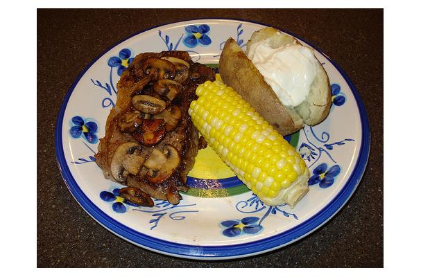 In large pan add cut up bite size pieces of steak, salt, pepper and garlic powder. Cook until meat is slightly brown. Add chopped onion and chopped green pepper. Cook until onion is slightly clear. Add jar of gravy and can of mushrooms. Add 2 jars of water from gravy jar, stir and mix well. Cover and simmer for 1 1/2 hours or until mixture has boiled down and is thick. Slice pre-baked potatoes and cover with steak gravy. Take cheese and cover top, put under broiler until melted. Serve.