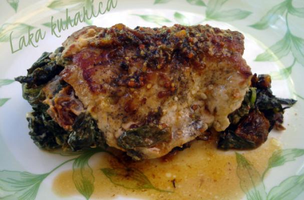 Thinly beat with a meat mallet each chop. Place ¼ of the spinach and sun-dried tomato mixture on the each chop, fold in half and secure with a wooden or metal toothpick. Season the outside of the pork with pepper.