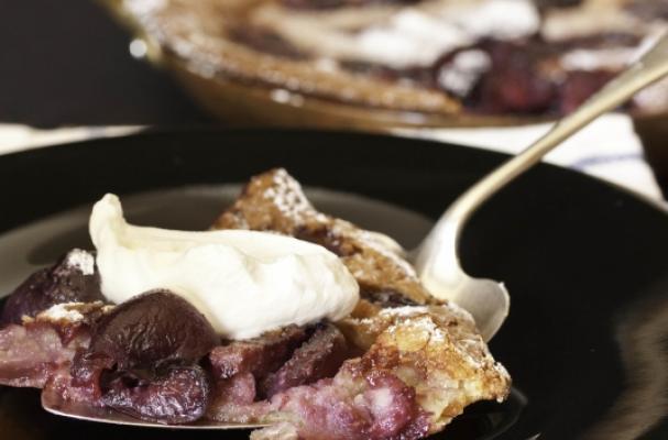 Clafoutis is a dessert originating in 19th century from the Limousin region of France. The name stems the verb clafir, which literally means “to fill” – (the fresh black cherries with a custard like batter). The dish calls for slivered almonds and butter along with a hint of almond and vanilla flavors, covered in a custard-like batter and baked. It is finished with a sprinkling of powdered sugar and served lukewarm. Clafoutis is also made with apples, plums, pears, blackberries or raspberries, and is even better with a dollop of fresh whipped cream or ice cream – the perfect remedy for a hot summer day.