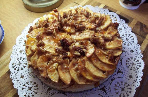 In the mean time melt the preserve and once the apples a lightly cooled brush the preserve over apples to coat all and give a nice sheen to the top. Sprinkle the pecans over the apples. Now carefully run a knife around the edges of the cake to loosen from the sides of the pan and then cover and refrigerate for at least 5 hours, overnight even better.