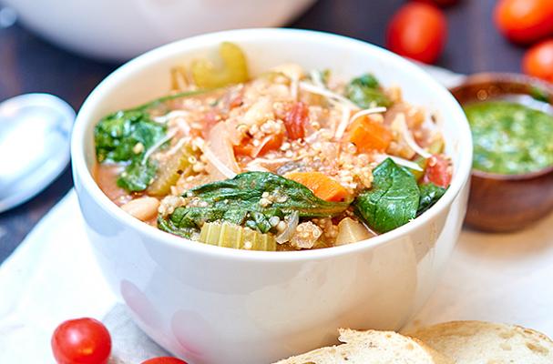 The Best Quinoa Minestrone - A hearty and healthy soup filled with quinoa, pesto, white wine, tons of veggies and pancetta!
