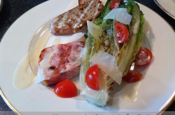 When you have flipped the peameal bacon, place each romaine on the grill cut side down. Grill to desired char (Roland likes a real char, and it was delicious, but if you suffer from heart burn, you will not want to char too much).