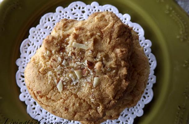 In a mix master combine yellow cake mix, eggs, butter, vanilla extract, almond extract and chopped almonds. Mix all together until cookie batter is formed. Spoon cookies on a lightly greased cookie sheet, flatten with fork and top with almond chopped almonds.