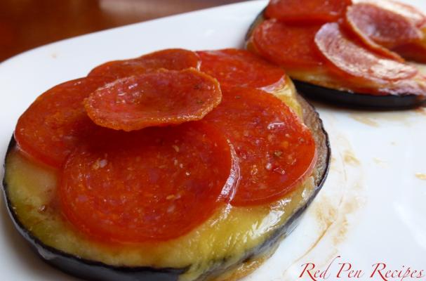 Once the pan is preheated, add the eggplant slices. Cook for 5 minutes. Take the pan out of the oven and turn over the eggplant slices. Spoon tomato sauce onto each slice. Top with cheese and pepperoni. Put back in oven and cook for another 5 minutes, or until the cheese is melted.