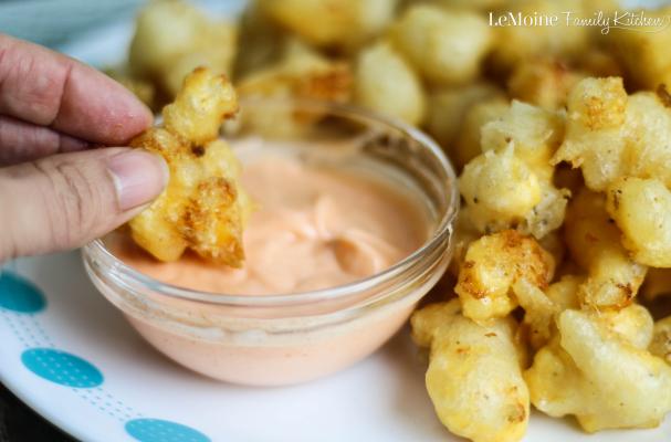 These curds are so so so good!!! The batter is really light thanks to the bubbly beer, they are quickly fried and the cheese is just perfectly melted inside! I made a really quick and simple dipping sauce to go along with the curds, mayo, Franks Red Hot and a little garlic powder. Self control needs to come into play here because you can’t just pop 5 of these Beer Battered Cheese Curds!