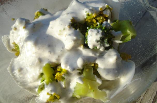 Crisp broccolli florets with savory blue cheese dressing: ideal for all Atkins dieters.