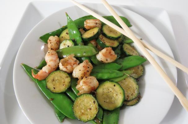 In a wok or skillet, add olive oil and shallot, cook until tender about 2 -3 minutes. Add snow peas and zucchini, cook for about another 3 minutes and then add your shrimp and a dash of pepper. Cook until shrimp is no longer pink about 2 to 3 minutes longer.