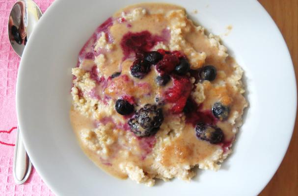 Put your oatmeal in your bowl, top with berries and peanut butter mixture.