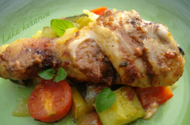 Delicious chicken drumsticks coated with pesto sauce with mixed vegetables.