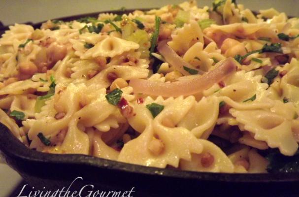 Prepare the macaroni and barley as directed. Add the barley to the pan with chickpeas and toss. Add a few tablespoons of the hot water from the macaroni to the pan and toss. Add the chopped fresh parsley and toss once again. Season again to taste.