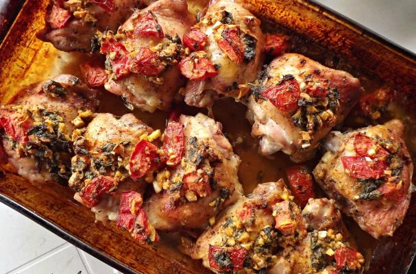 Wonderful, awesome recipe; good enough for company. Rub and topping can be made ahead and this probably improves the flavor. I used fresh basil I grow myself and this gives a fresh and alive flavor plus, makes the house smell inviting while baking. I used 8 thighs and doubled the rub and topping amounts because the recipe amounts looked too skimpy.