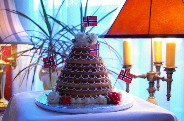 This traditional towering marzipan dessert is often served at Scandinavian weddings and at New Years. The cornucopia-shaped cake (though actually more of a cookie) promises a future of happiness and prosperity. The cake is adorned with little flags and served with champagne at midnight.