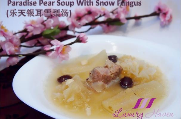 Add salt & serve your delicious Paradise Pear Soup With Snow Fungus (乐天银耳雪梨汤) piping hot!