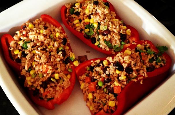 In these Southwest Stuffed Peppers I used the leftover spanish rice, added some corn, black beans and fresh cilantro. Topped with organic black bean salsa and baked in the oven until the pepper is tender. Finish off with a dollop of light sour cream and you've got yourself a wonderful meal! There really isn't a recipe to this its more the method... there are endless varieties!