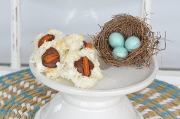 Cover baking sheet with parchment paper. Drop coconut mixture into mounds, using approximately 1 tablespoon for each mound. Press small indentation into center of each.
