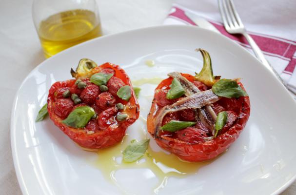 6. When ready remove from oven, place 2 small anchovy fillets on each pepper, or 5 or 6 capers per pepper if making the vegetarian version. Drizzle in more olive oil and top with basil leaves.