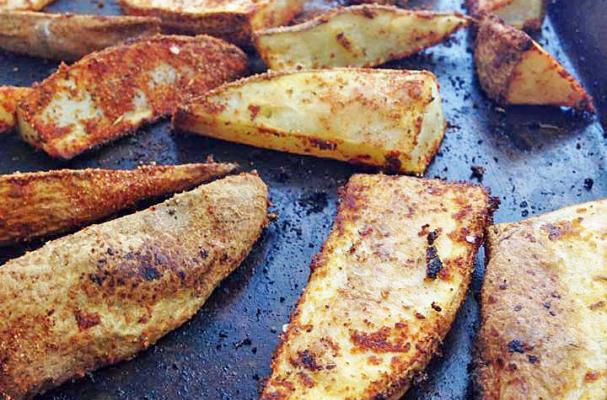 Spray cookie sheet with olive oil cooking spray. Place potatoes on cookie sheet. Toss with olive oil. Sprinkle spice mixture over potatoes and toss.