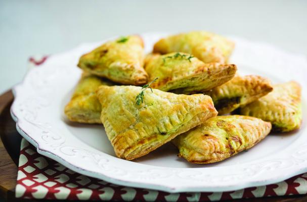 Lay out the puff pastry and brush each one with the egg wash. Put a heaping tablespoon of filling in the middle. Fold the edge over to make a triangle and seal the edges with the tines of a fork. Prick two rows of holes on top and move to a parchment lined cookie sheet.