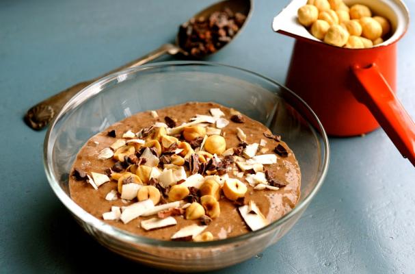 Blend to a fine creamy mousse consistency. Serve in a bowl and garnish with chopped, toasted hazelnuts, coconut flakes and cocoa nib.