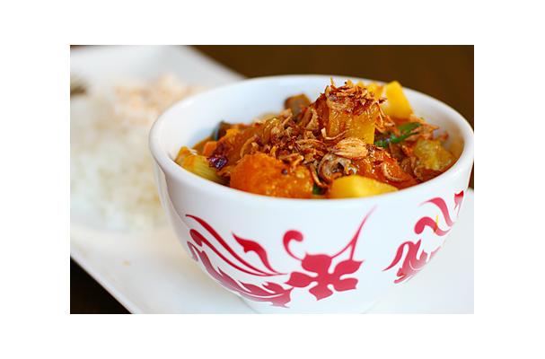 Allow the mixture to come to a boil. Then add in the vegetables in this order - french beans, pumpkin and the eggplant that was set aside earlier.
