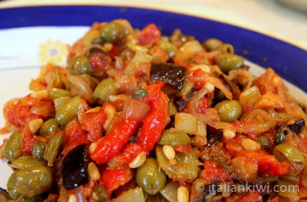 Caponata is the super-hero of dishes: is it an aperitif? Is it a main dish? Is it a side? Or, is it a pasta sauce? It's everything! You can't beat that….maybe if you add enough sugar, or some whipped cream, it could also become a strange nouvelle cusine dessert…..This is a "plate-of-all-trades". It's a fabulous mixture of aubergine (eggplant), capsicum, onions, olives, and capers that can be nearly any part of a menu you want it to be. You can eat it hot, tepid or cold. You can add more of one ingredient and less of others, depending on your tastes. This dish is eaten everywhere in Sicily, Italy. It's perfect for hot Summer days!