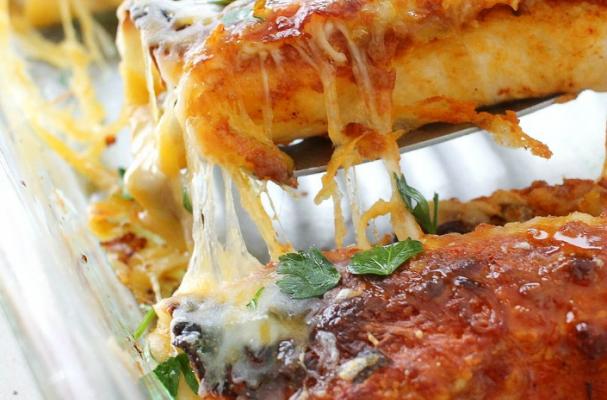 Spread the remaining enchilada sauce over the top of the tortillas, and sprinkle with the remaining shredded cheese.