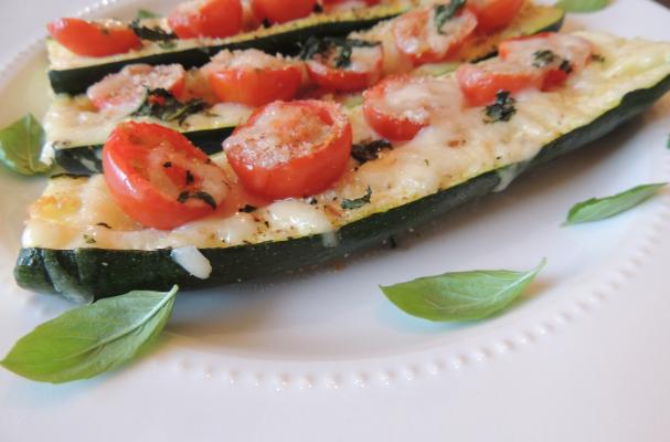 Crispy zucchini topped with garlic, cheese, tomatoes and basil, and then baked until golden and bubbling with cheesy goodness.