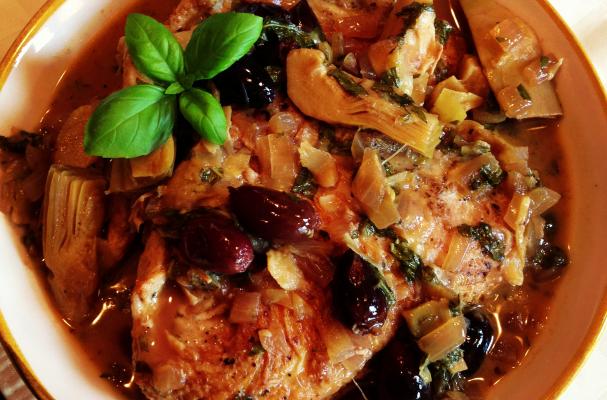 Add in the artichoke hearts, olives and broth. Add the chicken back to the pot and simmer cover for about 20 minutes.