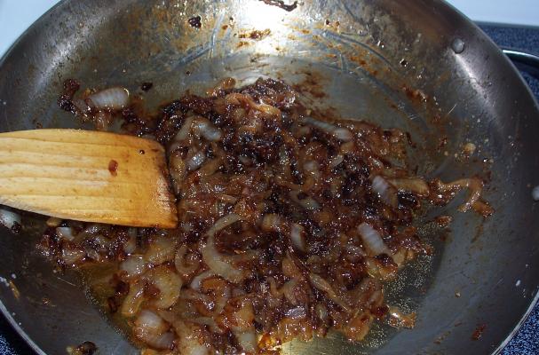 As the onions begin to brown with a spatula turn them allowing the onions to begin to brown evenly.