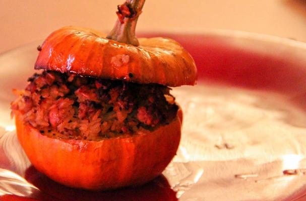 Place your stuffed pumpkins in a preheated oven and bake for 45 minutes, or until the stuffing is golden brown and the pumpkin flesh is tender