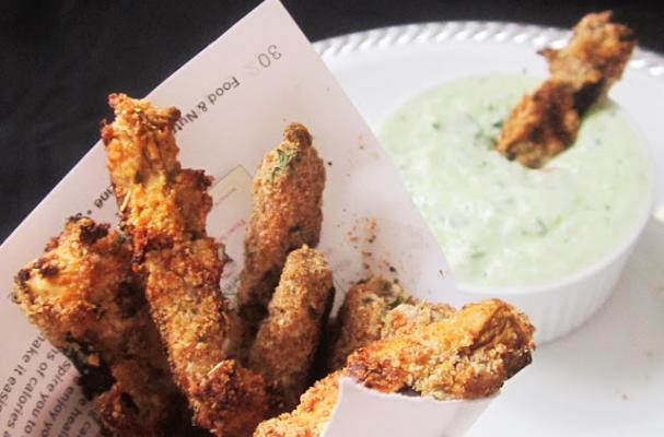 -First place the eggplant strips into egg/yogurt mixture then coat them in flour mixture evenly.