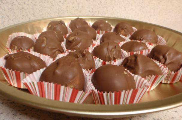 Remove balls from freezer. Using a fork dip each ball into melted chocolate. Shake any extra chocolate off. Place chocolate covered ball back onto parchment paper or into individual mini muffin liners.