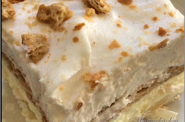 Dip cream crackers briefly in pineapple juice and arrange them in the bottom of a dish.