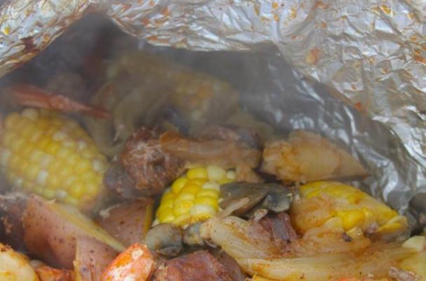 2. Evenly distribute corn, potatoes, mushroom, onion, shrimp, and sausage between 2 to 3 heavy-duty aluminum foil sheets.