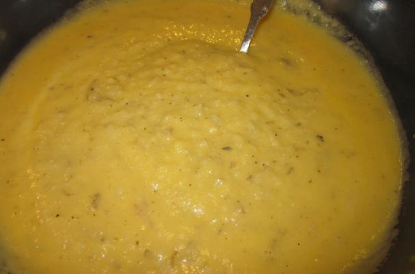 Add vegetable stock, puree with an immersion "hand" blender until desired consistency.