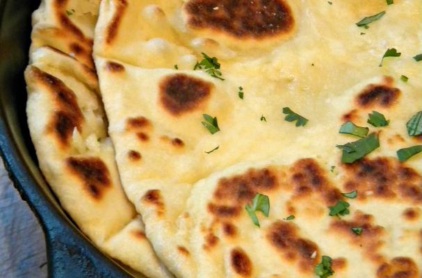 6. Heat the remaining oil in a large nonstick skillet over medium heat until the oil begins to shimmer. Wipe the oil out of the skillet with paper towels, then add the rolled out dough, sprayed side down and spray the other side lightly. Cover skillet and cook until spotty brown underneath, 2-4 minutes (poke any large bubbles that form). Flip naan, cook, covered, another 2-3 minutes until browned. Flip again, brush with butter, then transfer to a plate and cover with foil. While rolling out and cooking the remaining naan.