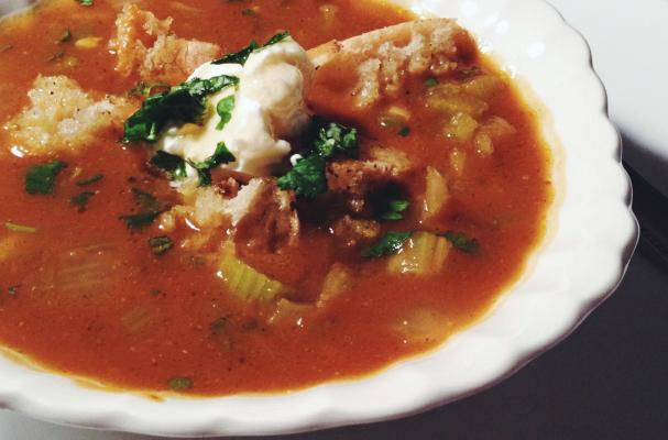 When you are ready to serve; ladle the soup into a bowl; top with the croutons, dollop of sour cream, drizzle of honey and a few cilantro leaves.