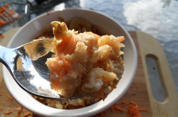 Add the oats, cinnamon, vanilla extract and chopped walnuts to a ramekin or oven-safe bowl. Chop half of the banana and add to the ramekin along with the grated carrot (and raisins if desired).