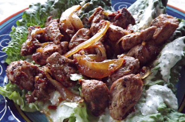 Place the cubed meat in a container and pour the seasoning over the meat. Work the seasonings into the meat; cover and refrigerate for at least one hour.